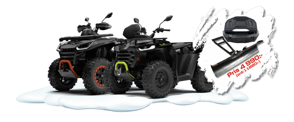 När du köper valfri ATV får du två fantastiska tillbehör för ett kampanjpris. En plog och packväska för endast 4990 kr (ord pris: 11 800 kr) Erbjudandet gäller till 30 januari.